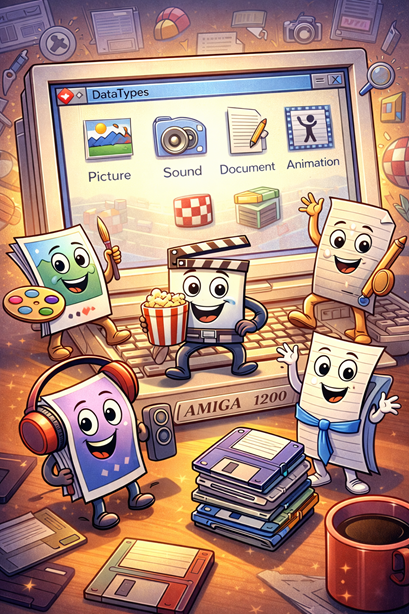 As you might know, DataTypes on the Amiga is a universal system for managing files in different formats. This lets an application query the datatypes.library to load or save a file, while the OS takes care of converting the format. If a user installs new DataTypes on their computer, all existing programs using the DataTypes system will instantly work with the new format.